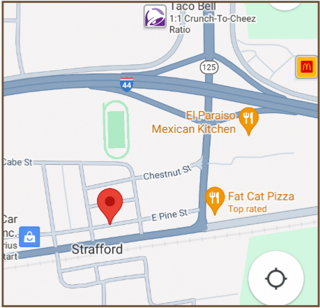 I-44 to Strafford, Mo. Take exit 88 to South on Hwy 125 past 2 gas stations. Turn Right on E. Pine Street. We are a block and a half on the left. Guest parking and main entrance is on E. Pine Street. Additional parking in gravel lot on east side of the building.